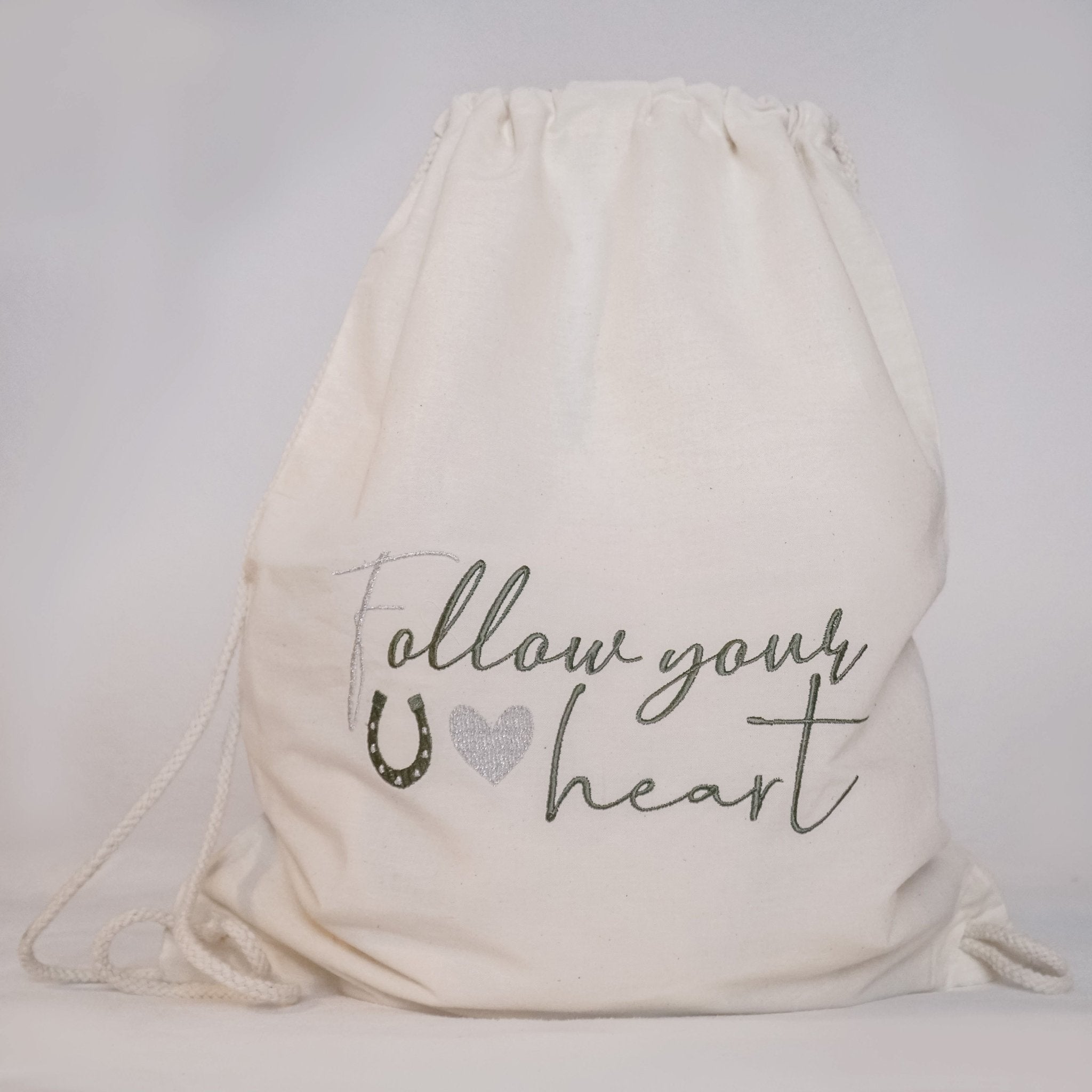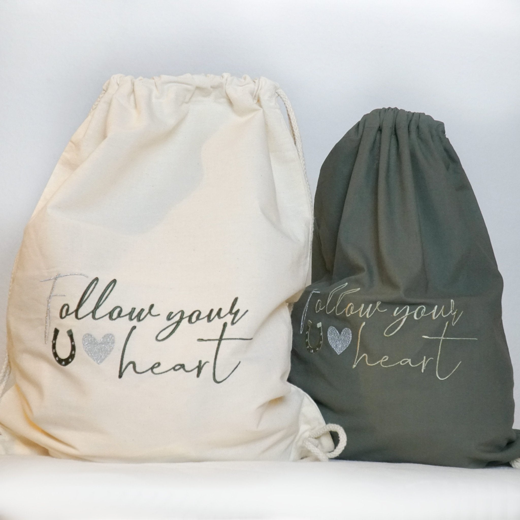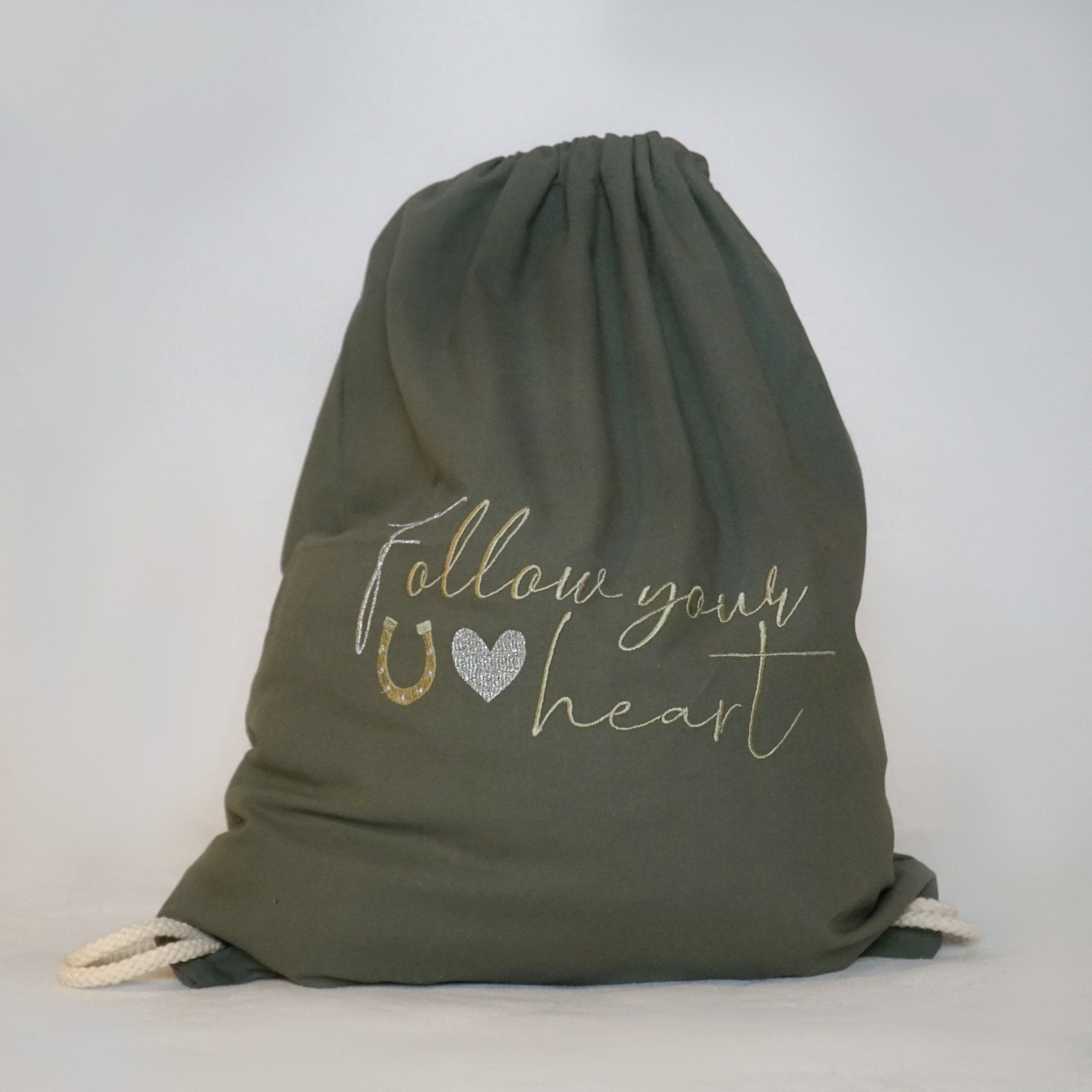 Cooler GymBag mit "Follow your heart" Bestickung und seitlichen Kordeln zum Überziehen. Ein absolutes Must-have!
