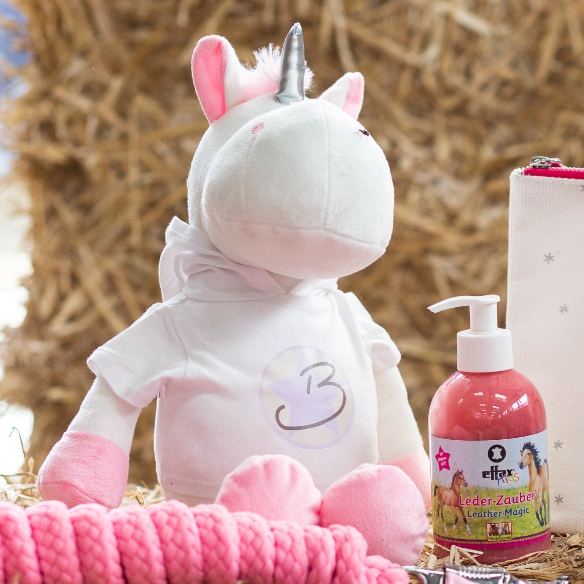 Plüscheinhorn „BinieBo“ sitzend 25cm, aus kuschelweichem Material; waschbar bis 30 °C. Material: 100 % Polyester.